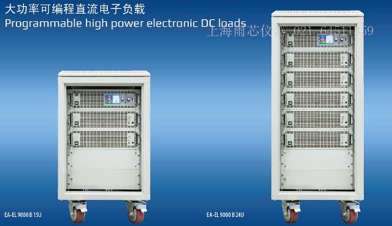 新系列電子負載EA-EL 9000 B 15U 與 EA-EL 9000B 24U,是EA-EL 9000 B系列大功率型號裝于可移動19“機柜組成的。因此會有20組不用的配置,形成不同的功率級別。一個機柜系統可被當作一個擴大功率的單機負載,在具有EA-EL 9000 B系列標準型號的基本特性外,也有手動操作與遠程控制。
