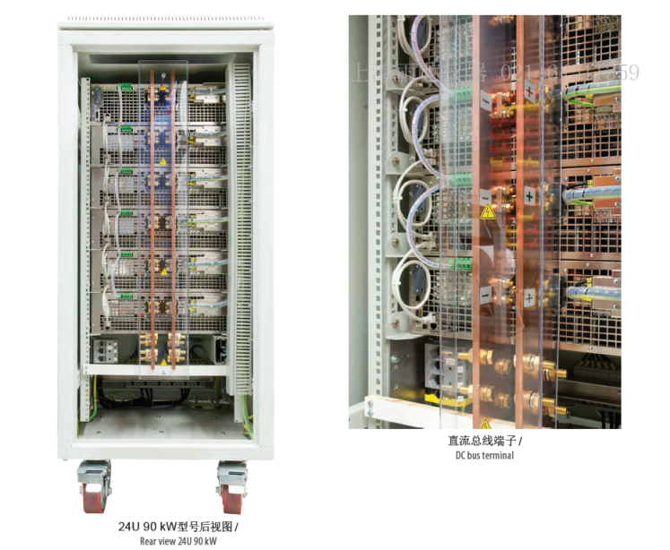 本系列供有兩種機柜尺寸,15U或24U,根據型號不同,可配3至6臺負載。有些型號通過重裝,增加另外一臺負載,則可擴展更大功率。這些機柜有可鎖定后門與前門,以及四個可固定的腳輪。機柜系統可完全配置好出貨,待安裝到指定位置后即可使用。