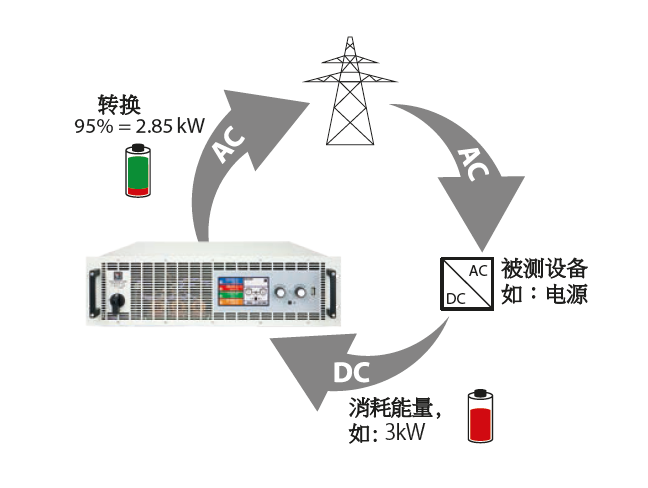 本負載最主要的特點是,當與電網連接時,其AC輸入端,也可用作帶載操作期間所供直流電量返回時的輸出端,且轉換效率高達95%。這種能量轉換方式有助于降低用電成本,且避免使用昂貴的制冷系統,因為普通電子負載使用過程中會將直流輸入電量轉化成熱量,從而需要制冷系統進行冷卻。原理示意圖如下: