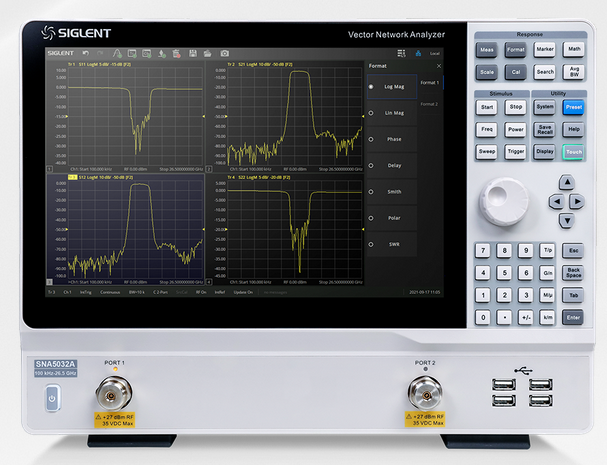 除開(kāi)外觀設(shè)計(jì),其先進(jìn)的用戶界面,配合上12.1英寸超大觸摸屏與外接的鼠標(biāo)和鍵盤(pán),讓工程師能更快的添加或刪除窗口,通道和跡線。SNA5000A支持在多個(gè)窗口下,添加多條跡線進(jìn)行S參數(shù)測(cè)量。并且測(cè)量結(jié)果,可以多種數(shù)據(jù)格式顯示,如 Log Mag,Lin Mag,Phase,Delay,Smith,SWR,Polar等,可以方便快捷地分析被測(cè)物的傳輸系數(shù),反射系數(shù),駐波比,阻抗匹配,相位,延時(shí)等參數(shù)。
